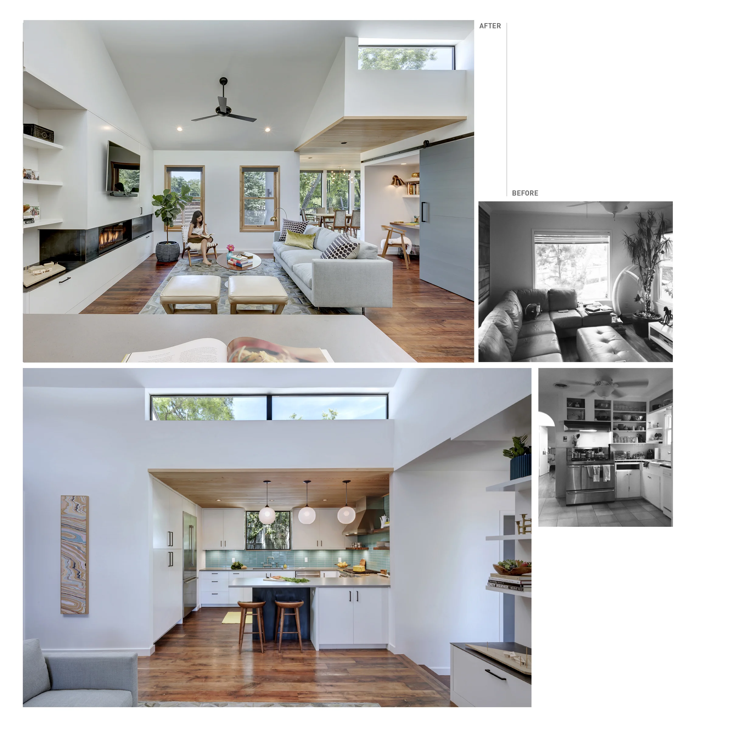 New roof geometry and corollary clerestory windows are key components of the design, allowing natural light to reach the full depth of each space in nuanced ways. The original, simple gable structure was kept intact and articulated as a crisp white box to juxtapose the wood-lined, glass box additions for the master suite and the dining/entry space. Wood windows and tall gable ceilings offset the original interior from the compressed, cypress-lined, glassy spaces of the additions. The articulation of new versus old is further emphasized by the natural light that pierces through the clerestory windows at points of connection. At all times, one is aware of the conceptual principles of the project.